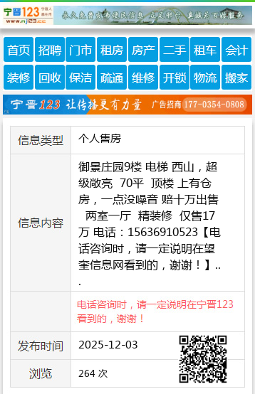 御景庄园9楼 电梯 西山,超级敞亮 70平 顶楼 上有仓房,一点没噪音 赔十万出售 两室一厅 精装修 仅售17万 电话:15636910523 【电话咨询时,请一定说明在望奎信息网看到的,谢谢!】 |
