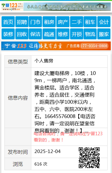 建设大厦电梯房,10楼,109m,一梯两户,南北通透,黄金楼层。适合学区,适合养老,适合居住,交通便利,距离四小学100米以内,五中、六中、医院200米左右。16645576008 【电话咨询时,请一定说明在望奎信息网看到的,谢谢!】 |