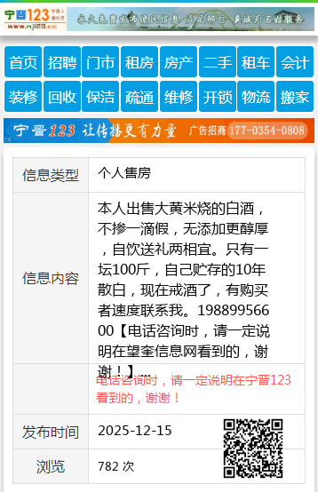 本人出售大黄米烧的白酒,不掺一滴假,无添加更醇厚,自饮送礼两相宜。只有一坛100斤,自己贮存的10年散白,现在戒酒了,有购买者速度联系我。19889956600 【电话咨询时,请一定说明在望奎信息网看到的,谢谢!】 |