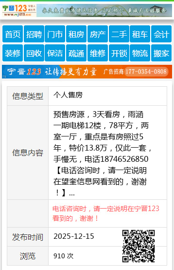 预售房源,3天看房,雨涵一期电梯12楼,78平方,两室一厅,重点是有房照过5年,特价13.8万,仅此一套,手慢无,电话18746526850 【电话咨询时,请一定说明在望奎信息网看到的,谢谢!】 |