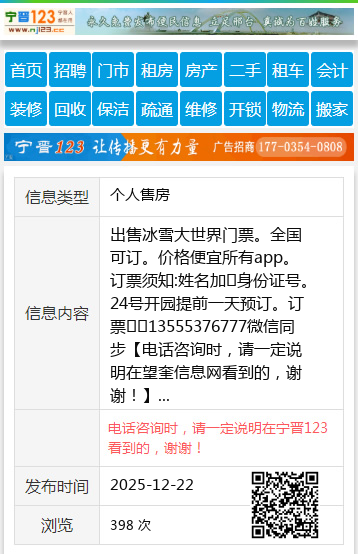 出售冰雪大世界门票。全国可订。价格便宜所有app。订票须知:姓名加➕身份证号。24号开园提前一天预订。订票☎️13555376777微信同步 【电话咨询时,请一定说明在望奎信息网看到的,谢谢!】 |