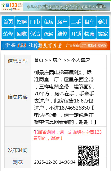 御景庄园电梯高层9楼,标准两室一厅,屋里东西全带,三样电器全带,建筑面积70平方,房本在手,手牵手去过户,此房仅售16.6万包过户,不讲18746526850 【电话咨询时,请一定说明在望奎信息网看到的,谢谢!】 |