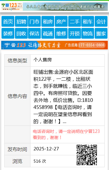 旺铺出售:金源府小区北区面积122平,一二楼,出租状态,到手就赚钱,临近三小四中。有房照可贷款。因要去外地,低价出售。☎:18104558998 【电话咨询时,请一定说明在望奎信息网看到的,谢谢!】 |