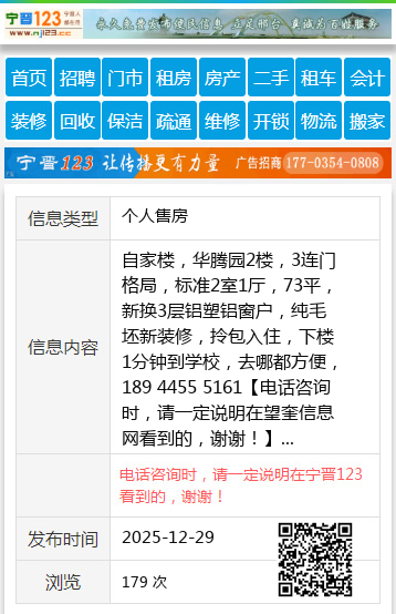 自家楼,华腾园2楼,3连门格局,标准2室1厅,73平,新换3层铝塑铝窗户,纯毛坯新装修,拎包入住,下楼1分钟到学校,去哪都方便,189 4455 5161 【电话咨询时,请一定说明在望奎信息网看到的,谢谢!】 |