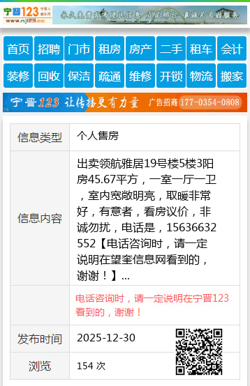 出卖领航雅居19号楼5楼3阳房45.67平方,一室一厅一卫,室内宽敞明亮,取暖非常好,有意者,看房议价,非诚勿扰,电话是,15636632552 【电话咨询时,请一定说明在望奎信息网看到的,谢谢!】 |