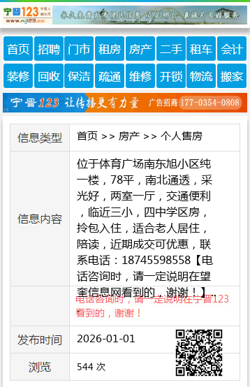 位于体育广场南东旭小区纯一楼,78平,南北通透,采光好,两室一厅,交通便利,临近三小,四中学区房,拎包入住,适合老人居住,近期成交可优惠,联系电话:18745598558