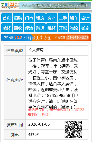 位于体育广场南东旭小区纯一楼,78平,南北通透,采光好,两室一厅,交通便利,临近三小,四中学区房,拎包入住,适合老人居住,陪读,近期成交可优惠,联系电话:18745598558 【电话咨询时,请一定说明在望奎信息网看到的,谢谢!】 |