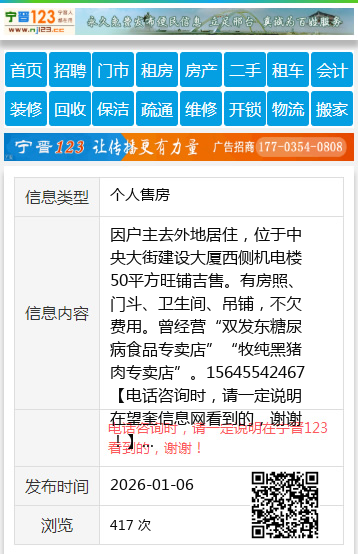 因户主去外地居住,位于中央大街建设大厦西侧机电楼50平方旺铺吉售。有房照、门斗、卫生间、吊铺,不欠费用。曾经营“双发东糖尿病食品专卖店”“牧纯黑猪肉专卖店”。15645542467 【电话咨询时,请一定说明在望奎信息网看到的,谢谢!】 |