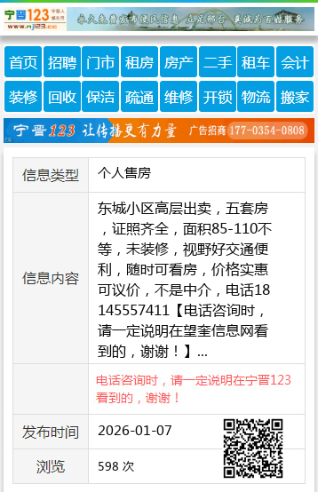 东城小区高层出卖,五套房,证照齐全,面积85-110不等,未装修,视野好交通便利,随时可看房,价格实惠可议价,不是中介,电话18145557411 【电话咨询时,请一定说明在望奎信息网看到的,谢谢!】 |