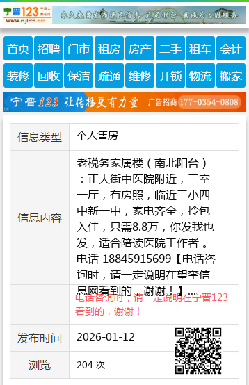老税务家属楼(南北阳台):正大街中医院附近,三室一厅,有房照,临近三小四中新一中,家电齐全,拎包入住,只需8.8万,你发我也发,适合陪读医院工作者 。电话 18845915699 【电话咨询时,请一定说明在望奎信息网看到的,谢谢!】 |