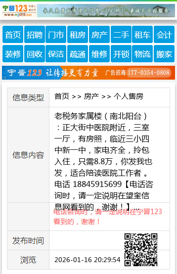 老税务家属楼(南北阳台):正大街中医院附近,三室一厅,有房照,临近三小四中新一中,家电齐全,拎包入住,只需8.8万,你发我也发,适合陪读医院工作者 。电话 18845915699 【电话咨询时,请一定说明在望奎信息网看到的,谢谢!】 |