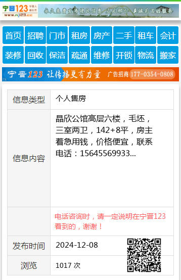 晶欣公馆高层六楼,毛坯,三室两卫,142+8平,房主着急用钱,价格便宜,联系电话:15645569933