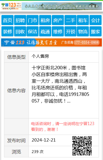 十字正街北200米,图书馆小区自家楼房出租出售,两室一大厅,南北通透西山,比毛坯房还低的价格,年租月租都可以,电话19917805057,非诚勿扰! 【电话咨询时,请一定说明在望奎信息网看到的,谢谢!】 |