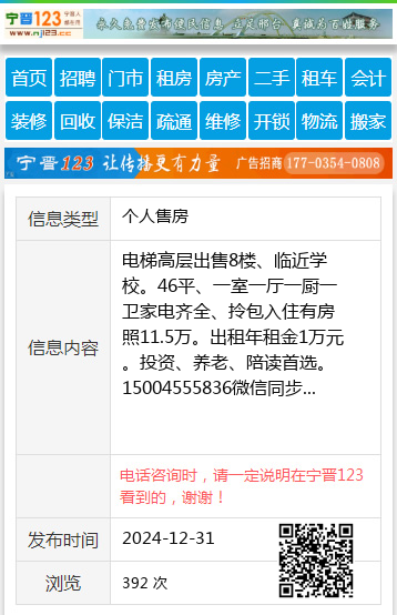 电梯高层出售8楼、临近学校。46平、一室一厅一厨一卫家电齐全、拎包入住有房照11.5万。出租年租金1万元。投资、养老、陪读首选。15004555836微信同步 【电话咨询时,请一定说明在望奎信息网看到的,谢谢!】 |