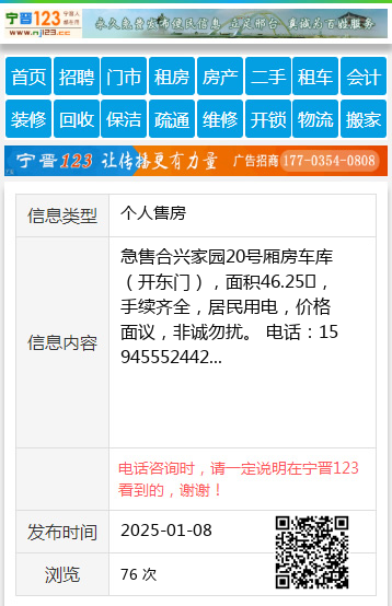 急售合兴家园20号厢房车库(开东门),面积46.25㎡,手续齐全,居民用电,价格面议,非诚勿扰。 电话:15945552442 【电话咨询时,请一定说明在望奎信息网看到的,谢谢!】 |