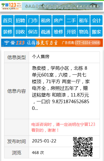 急卖楼,学苑小区,北栋 8单元601室,六楼,一共七楼顶,71平方 两室一厅,家电齐全,房照过五年了,赠送粘壁布 和喷漆,11.8万元,一口价 9.8万18746526850 【电话咨询时,请一定说明在望奎信息网看到的,谢谢!】 |