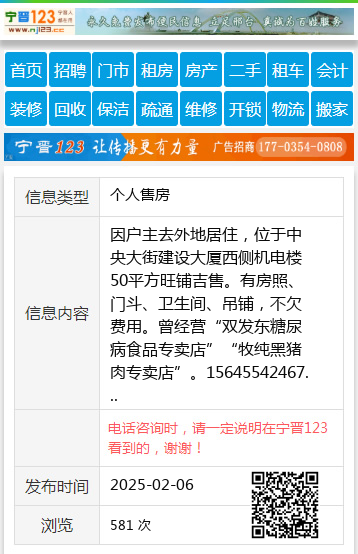 因户主去外地居住,位于中央大街建设大厦西侧机电楼50平方旺铺吉售。有房照、门斗、卫生间、吊铺,不欠费用。曾经营“双发东糖尿病食品专卖店”“牧纯黑猪肉专卖店”。15645542467 【电话咨询时,请一定说明在望奎信息网看到的,谢谢!】 |