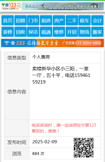 卖楼新华小区小三阳,一室一厅,五十平,电话15946159219