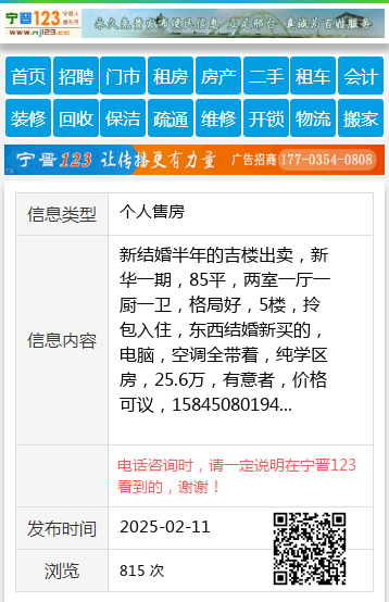 新结婚半年的吉楼出卖,新华一期,85平,两室一厅一厨一卫,格局好,5楼,拎包入住,东西结婚新买的,电脑,空调全带着,纯学区房,25.6万,有意者,价格可议,15845080194 【电话咨询时,请一定说明在望奎信息网看到的,谢谢!】 |