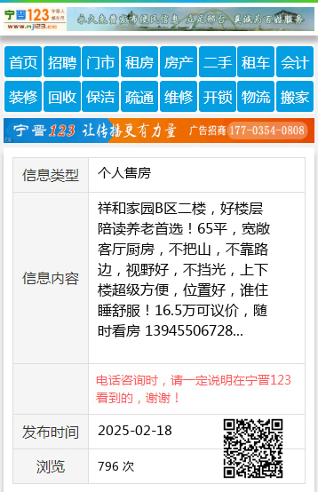 祥和家园B区二楼,好楼层陪读养老首选!65平,宽敞客厅厨房,不把山,不靠路边,视野好,不挡光,上下楼超级方便,位置好,谁住睡舒服!16.5万可议价,随时看房 13945506728 【电话咨询时,请一定说明在望奎信息网看到的,谢谢!】 |