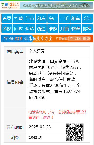 建设大厦一单元高层,17A西户面积107平,仅售23万,房本3年,没有任何陈欠,随时过户,配合任何贷款,毛坯,只需2200每平方,全款贷款随意,看房电话18746526850