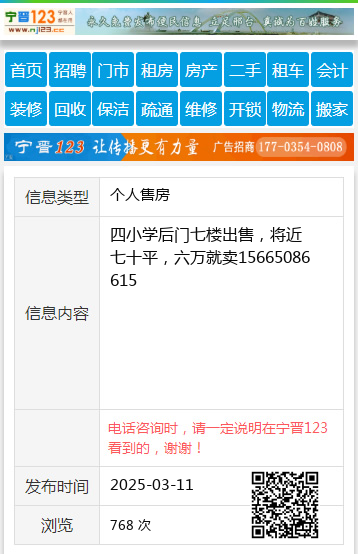 四小学后门七楼出售,将近七十平,六万就卖15665086615