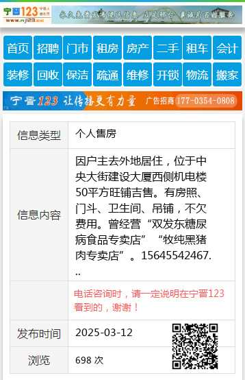 因户主去外地居住,位于中央大街建设大厦西侧机电楼50平方旺铺吉售。有房照、门斗、卫生间、吊铺,不欠费用。曾经营“双发东糖尿病食品专卖店”“牧纯黑猪肉专卖店”。15645542467 【电话咨询时,请一定说明在望奎信息网看到的,谢谢!】 |