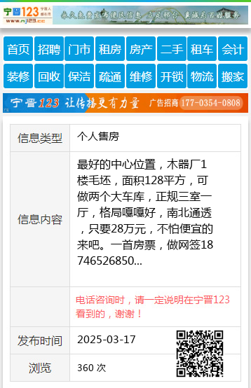 最好的中心位置,木器厂1楼毛坯,面积128平方,可做两个大车库,正规三室一厅,格局嘎嘎好,南北通透,只要28万元,不怕便宜的来吧。一首房票,做网签18746526850 【电话咨询时,请一定说明在望奎信息网看到的,谢谢!】 |
