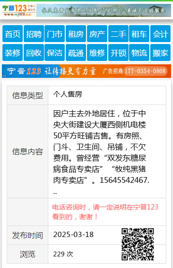 因户主去外地居住,位于中央大街建设大厦西侧机电楼50平方旺铺吉售。有房照、门斗、卫生间、吊铺,不欠费用。曾经营“双发东糖尿病食品专卖店”“牧纯黑猪肉专卖店”。15645542467 【电话咨询时,请一定说明在望奎信息网看到的,谢谢!】 |