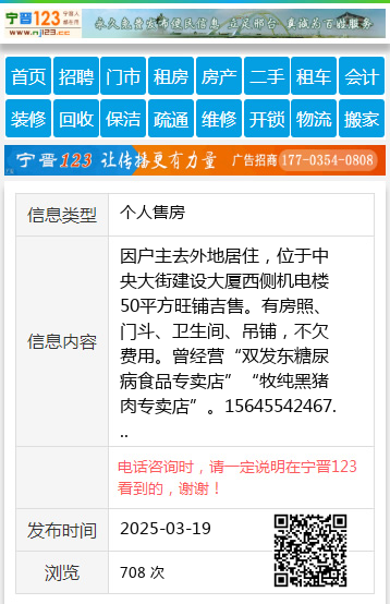 因户主去外地居住,位于中央大街建设大厦西侧机电楼50平方旺铺吉售。有房照、门斗、卫生间、吊铺,不欠费用。曾经营“双发东糖尿病食品专卖店”“牧纯黑猪肉专卖店”。15645542467 【电话咨询时,请一定说明在望奎信息网看到的,谢谢!】 |