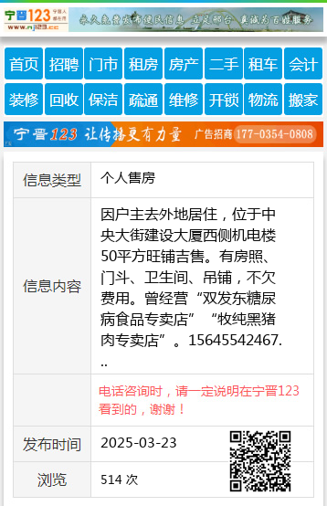 因户主去外地居住,位于中央大街建设大厦西侧机电楼50平方旺铺吉售。有房照、门斗、卫生间、吊铺,不欠费用。曾经营“双发东糖尿病食品专卖店”“牧纯黑猪肉专卖店”。15645542467 【电话咨询时,请一定说明在望奎信息网看到的,谢谢!】 |