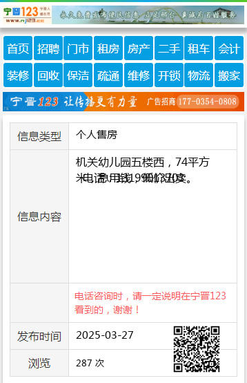 机关幼儿园五楼西,74平方米,急用钱,低价出卖。 电话:13199013703