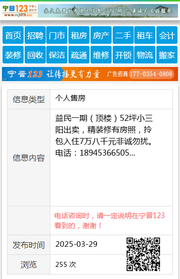 益民一期(顶楼)52坪小三阳出卖,精装修有房照,拎包入住7万八千元非诚勿扰。电话:18945366505