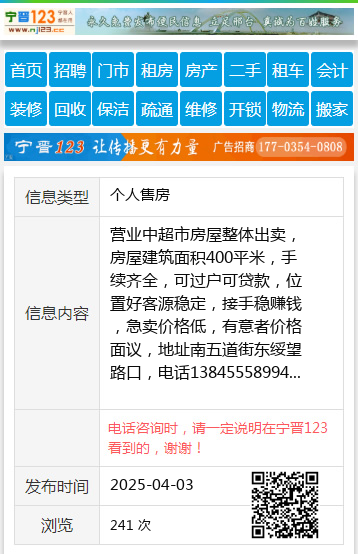 营业中超市房屋整体出卖,房屋建筑面积400平米,手续齐全,可过户可贷款,位置好客源稳定,接手稳赚钱,急卖价格低,有意者价格面议,地址南五道街东绥望路口,电话13845558994 【电话咨询时,请一定说明在望奎信息网看到的,谢谢!】 |