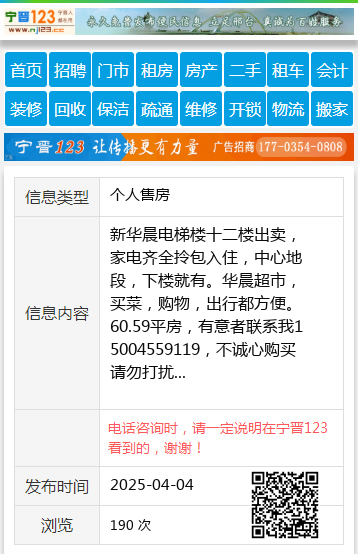 新华晨电梯楼十二楼出卖,家电齐全拎包入住,中心地段,下楼就有。华晨超市,买菜,购物,出行都方便。60.59平房,有意者联系我15004559119,不诚心购买请勿打扰 【电话咨询时,请一定说明在望奎信息网看到的,谢谢!】 |