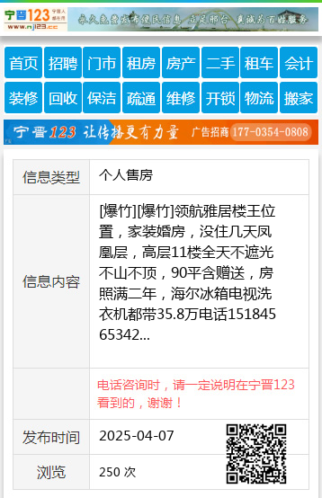 [爆竹][爆竹]领航雅居楼王位置,家装婚房,没住几天凤凰层,高层11楼全天不遮光不山不顶,90平含赠送,房照满二年,海尔冰箱电视洗衣机都带35.8万电话15184565342 【电话咨询时,请一定说明在望奎信息网看到的,谢谢!】 |