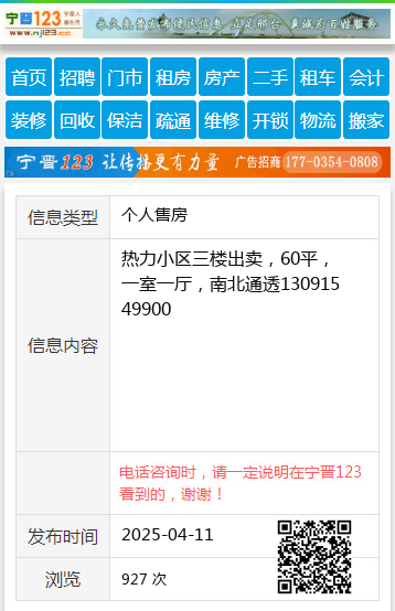 热力小区三楼出卖,60平,一室一厅,南北通透13091549900