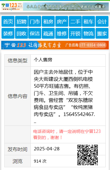 因户主去外地居住,位于中央大街建设大厦西侧机电楼50平方旺铺吉售。有仿照、门斗、卫生间、吊铺,不欠费用。曾经营“双发东糖尿病食品专卖店”“牧纯黑猪肉专卖店”。15645542467
