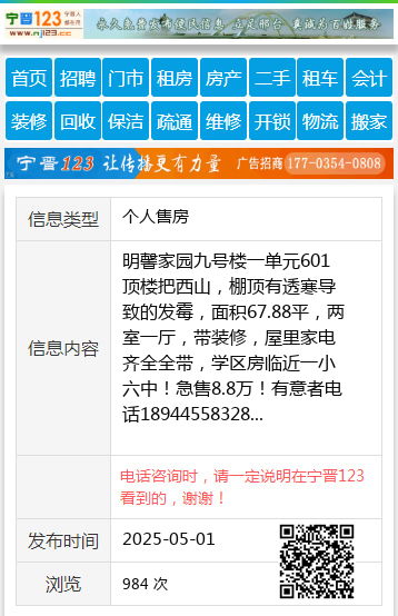 明馨家园九号楼一单元601顶楼把西山,棚顶有透寒导致的发霉,面积67.88平,两室一厅,带装修,屋里家电齐全全带,学区房临近一小六中!急售8.8万!有意者电话18944558328 【电话咨询时,请一定说明在望奎信息网看到的,谢谢!】 |