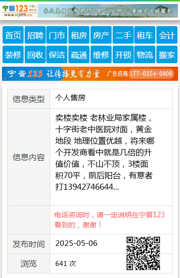 卖楼卖楼 老林业局家属楼,十字街老中医院对面,黄金地段 地理位置优越,将来哪个开发商看中就是几倍的升值价值,不山不顶,3楼面积70平,前后阳台,有意者打13942746644 【电话咨询时,请一定说明在望奎信息网看到的,谢谢!】 |