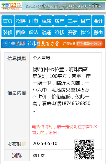 [爆竹]中心位置,明珠园高层3楼,100平方,两室一厅一厨一卫,临近大医院,一小六中,毛坯房只卖14.5万不讲价,价格超低,仅此一套,看房电话18746526850 【电话咨询时,请一定说明在望奎信息网看到的,谢谢!】 |
