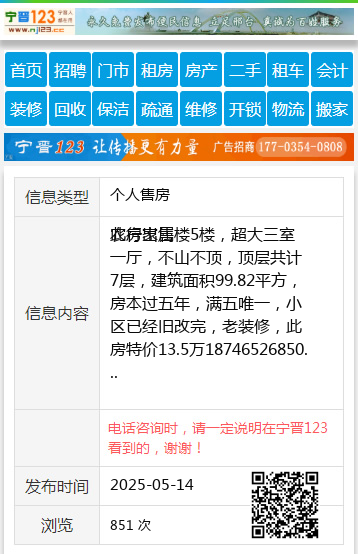 农行家属楼5楼,超大三室一厅,不山不顶,顶层共计7层,建筑面积99.82平方,房本过五年,满五唯一,小区已经旧改完,老装修,此房特价13.5万18746526850 【电话咨询时,请一定说明在望奎信息网看到的,谢谢!】 |