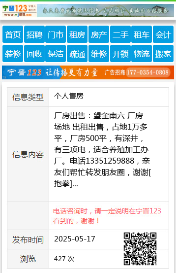 厂房出售:望奎南六 厂房 场地 出租出售,占地1万多平,厂房500平,有深井,有三项电,适合养殖加工办厂。电话13351259888,亲友们帮忙转发朋友圈,谢谢[抱拳] 【电话咨询时,请一定说明在望奎信息网看到的,谢谢!】 |