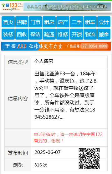 出售比亚迪F3一台,18年车,手动挡,银灰色,跑了2.8w公里,就在望奎接送孩子用了,全车铁件全是原版原漆,所有件都没动过。到手一分钱不用添,有想法来18945528627 【电话咨询时,请一定说明在望奎信息网看到的,谢谢!】 |