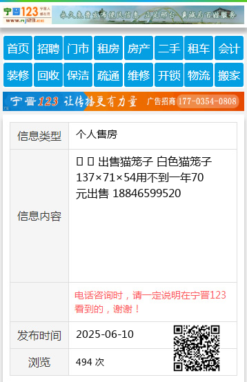出售猫笼子 白色猫笼子137×71×54用不到一年70元出售 18846599520