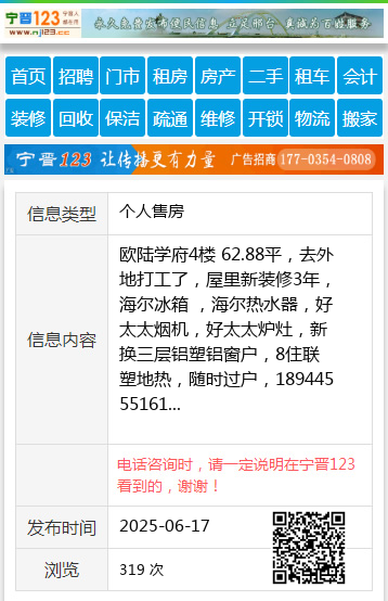 欧陆学府4楼 62.88平,去外地打工了,屋里新装修3年,海尔冰箱 ,海尔热水器,好太太烟机,好太太炉灶,新换三层铝塑铝窗户,8住联塑地热,随时过户,18944555161 【电话咨询时,请一定说明在望奎信息网看到的,谢谢!】 |