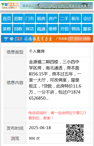 金源福二期四楼,三小四中学区房,南北通透,房本面积56.15平,房本过五年,一室一大厅,可改俩室,屋里板正,?贷款,此房特价11.6万,一分不讲,包过户18746526850 【电话咨询时,请一定说明在望奎信息网看到的,谢谢!】 |