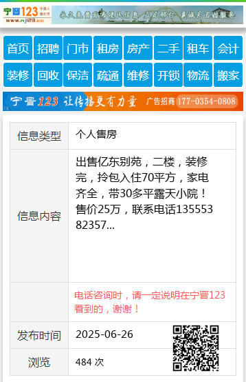 出售亿东别苑,二楼,装修完,拎包入住70平方,家电齐全,带30多平露天小院!售价25万,联系电话13555382357