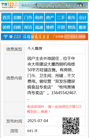 因户主去外地居住,位于中央大街建设大厦西侧机电楼50平方旺铺吉售。有房照、门斗、卫生间、吊铺,不欠费用。曾经营“双发东糖尿病食品专卖店”“牧纯黑猪肉专卖店”。15645542467 【电话咨询时,请一定说明在望奎信息网看到的,谢谢!】 |