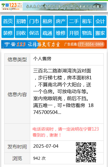 三百北二路澎湖湾洗浴对面,步行梯七楼,房本面积81,不算南北两个大阳台,送一个仓房。可放电动车等。室内宽敞明亮,前后不挡。满五唯一,可+微信看房 18745700504 【电话咨询时,请一定说明在望奎信息网看到的,谢谢!】 |